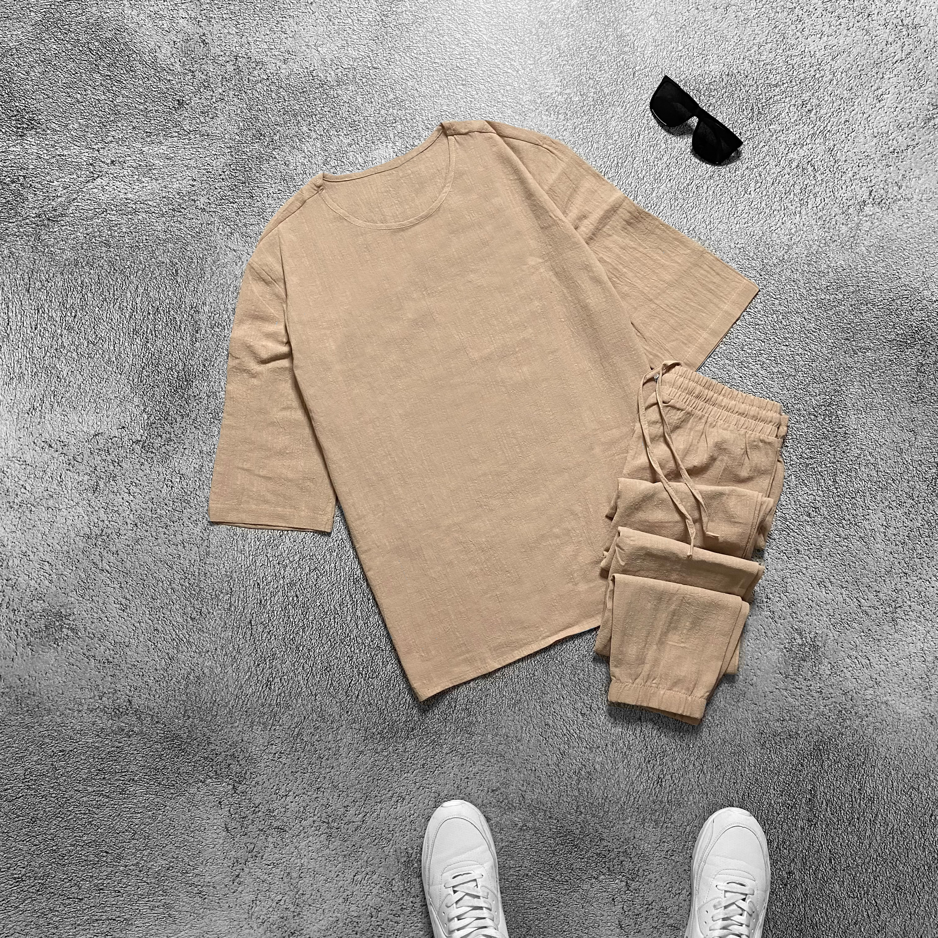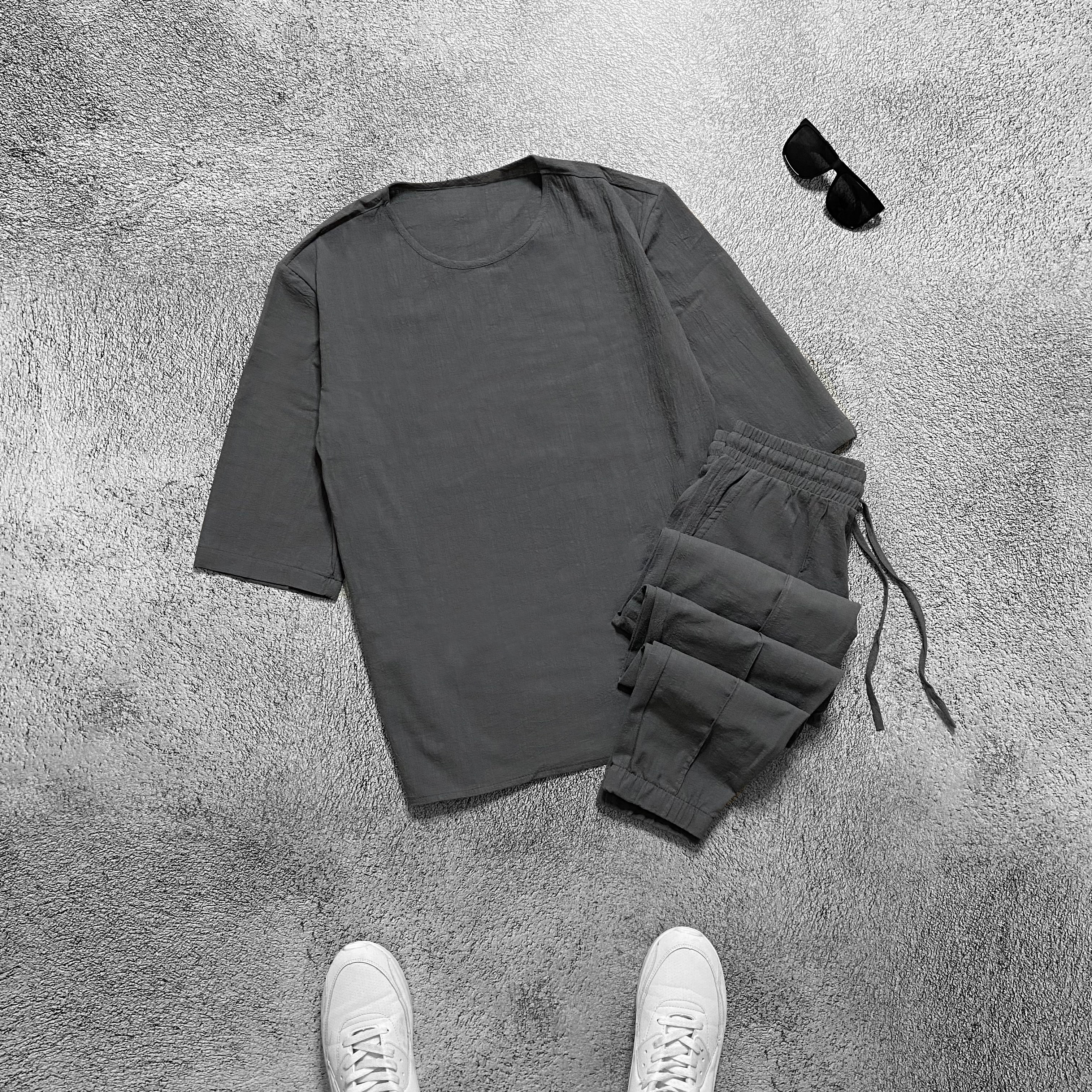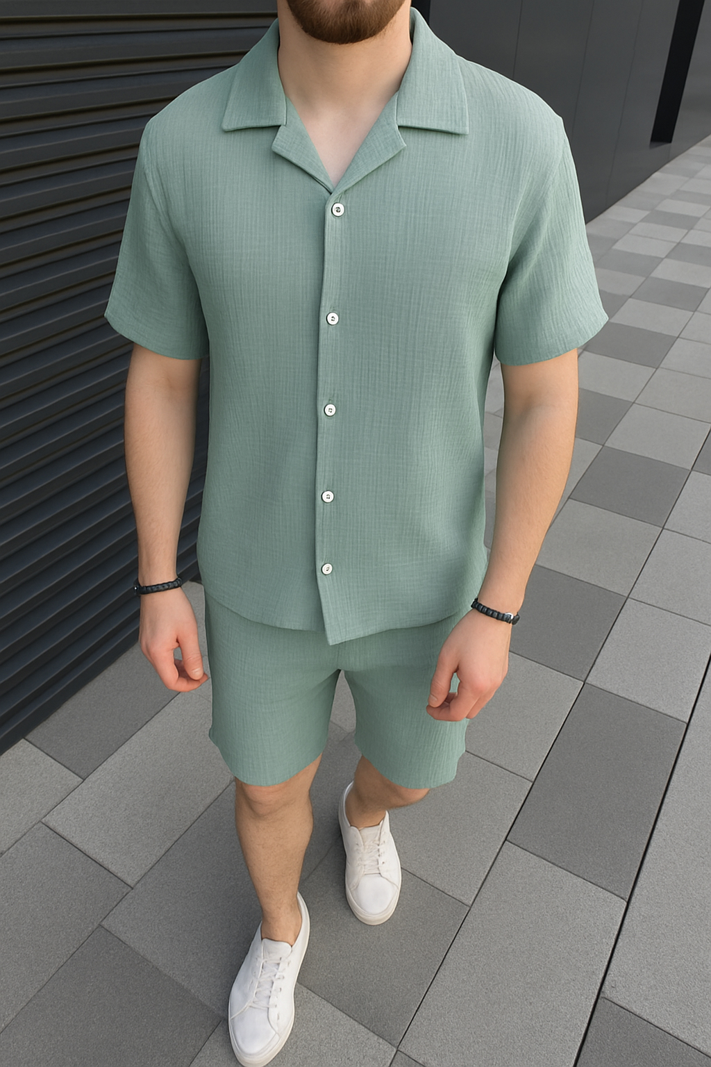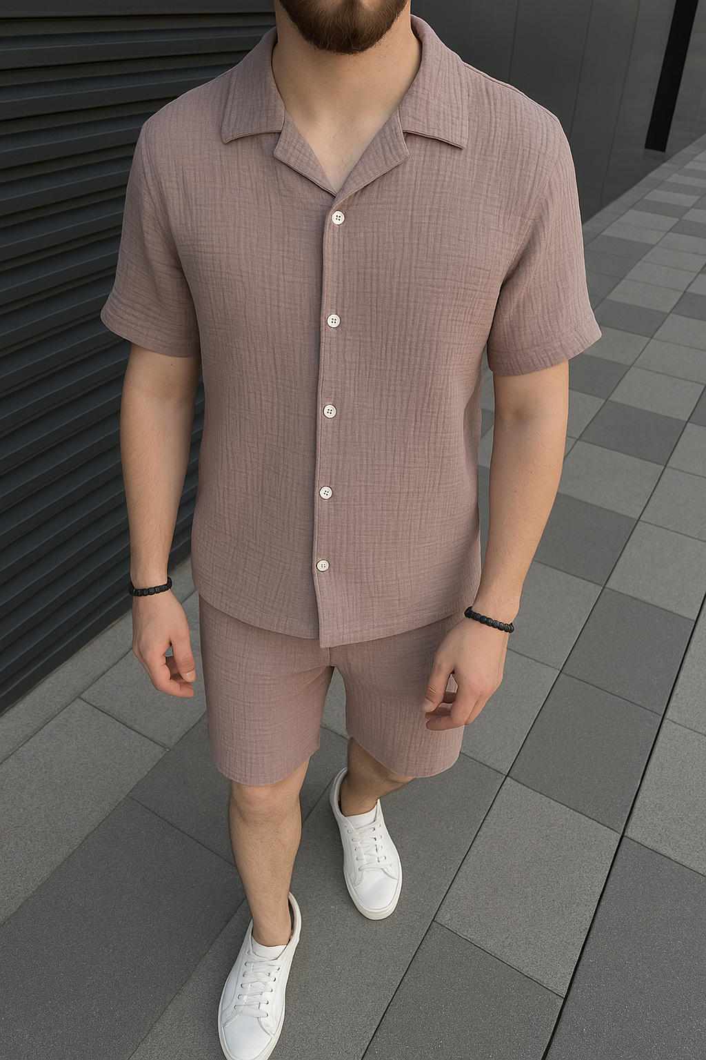 Рубашка свободного кроя, застегивается на 5 эко-пуговиц.