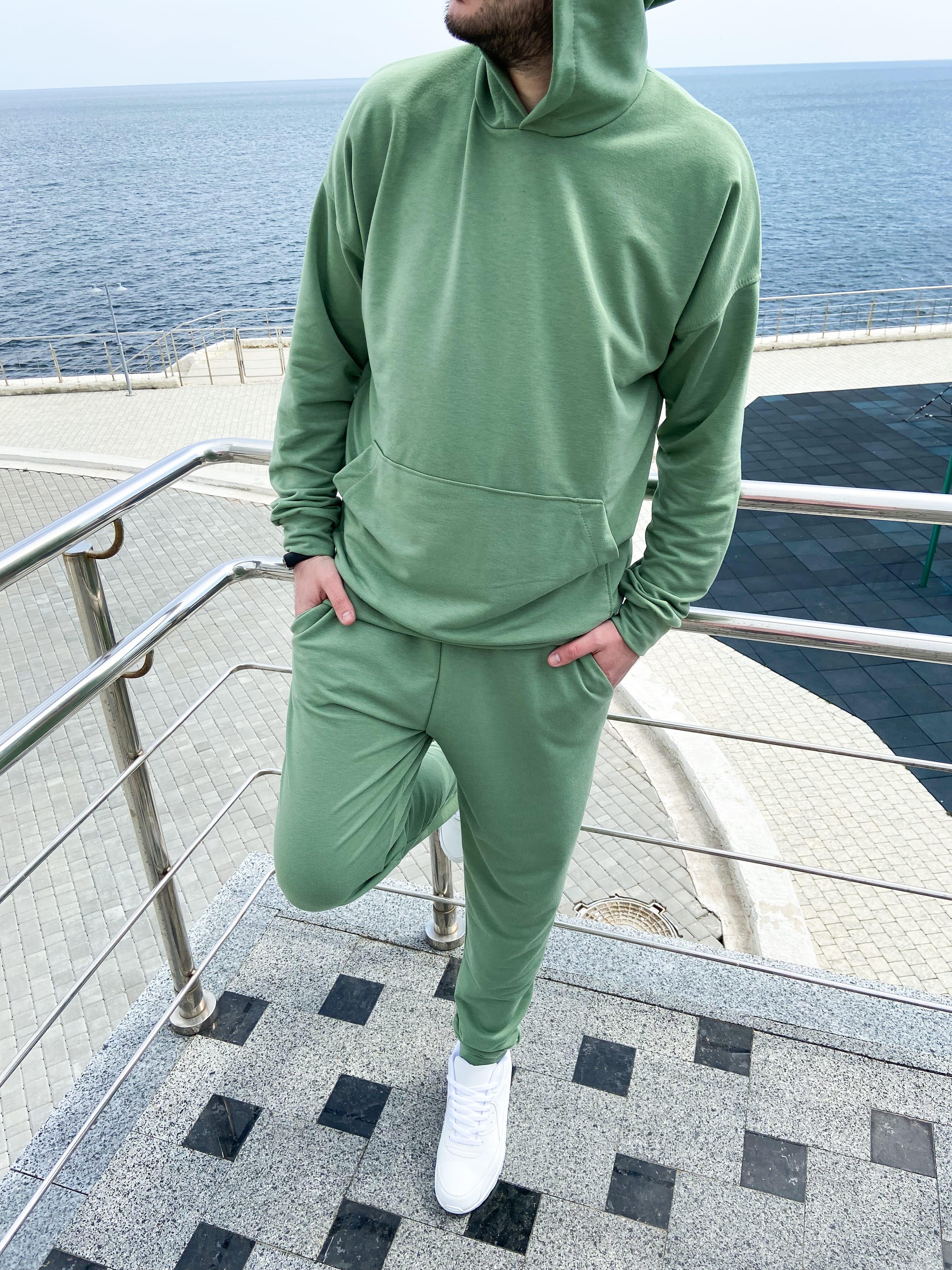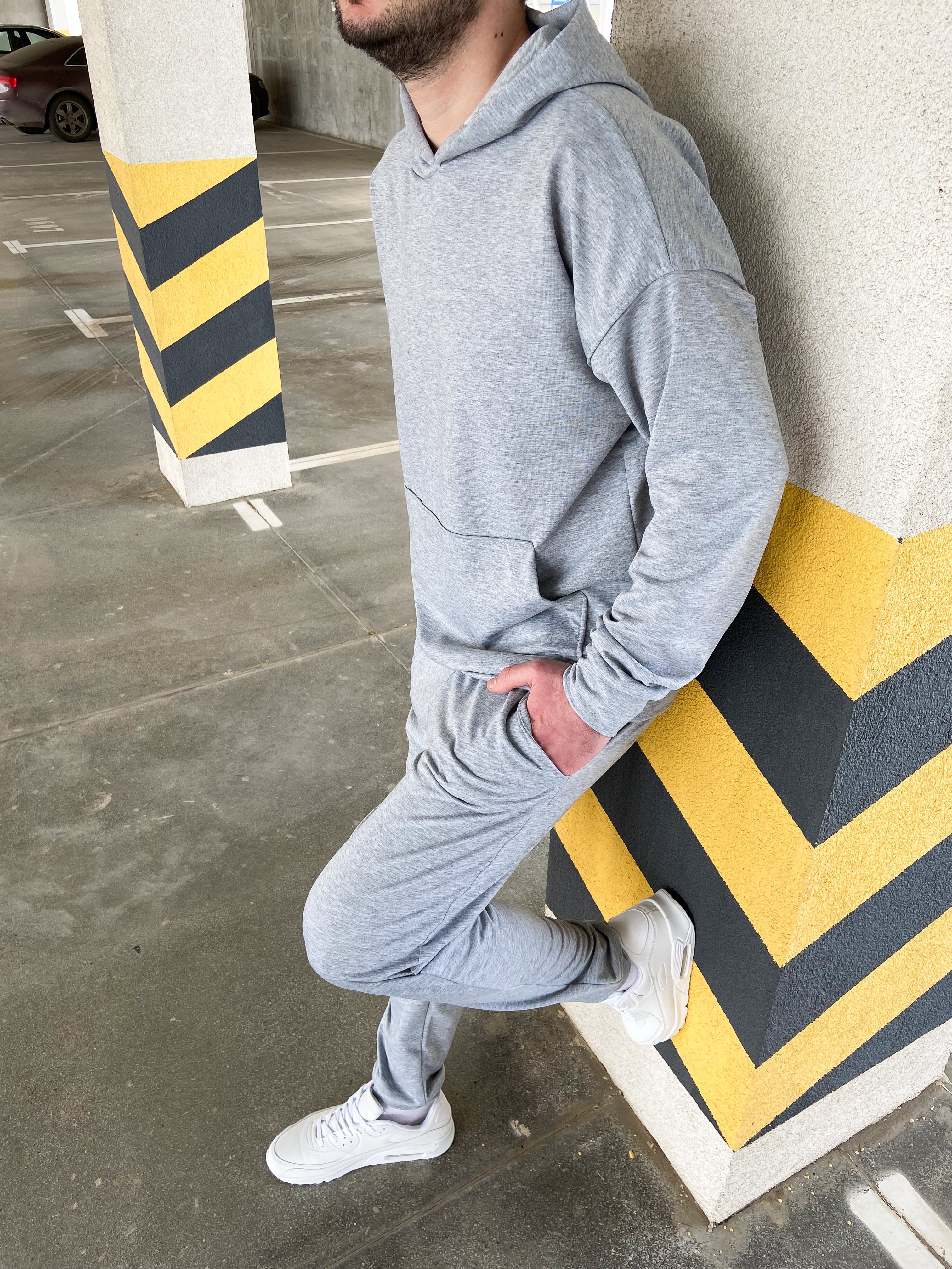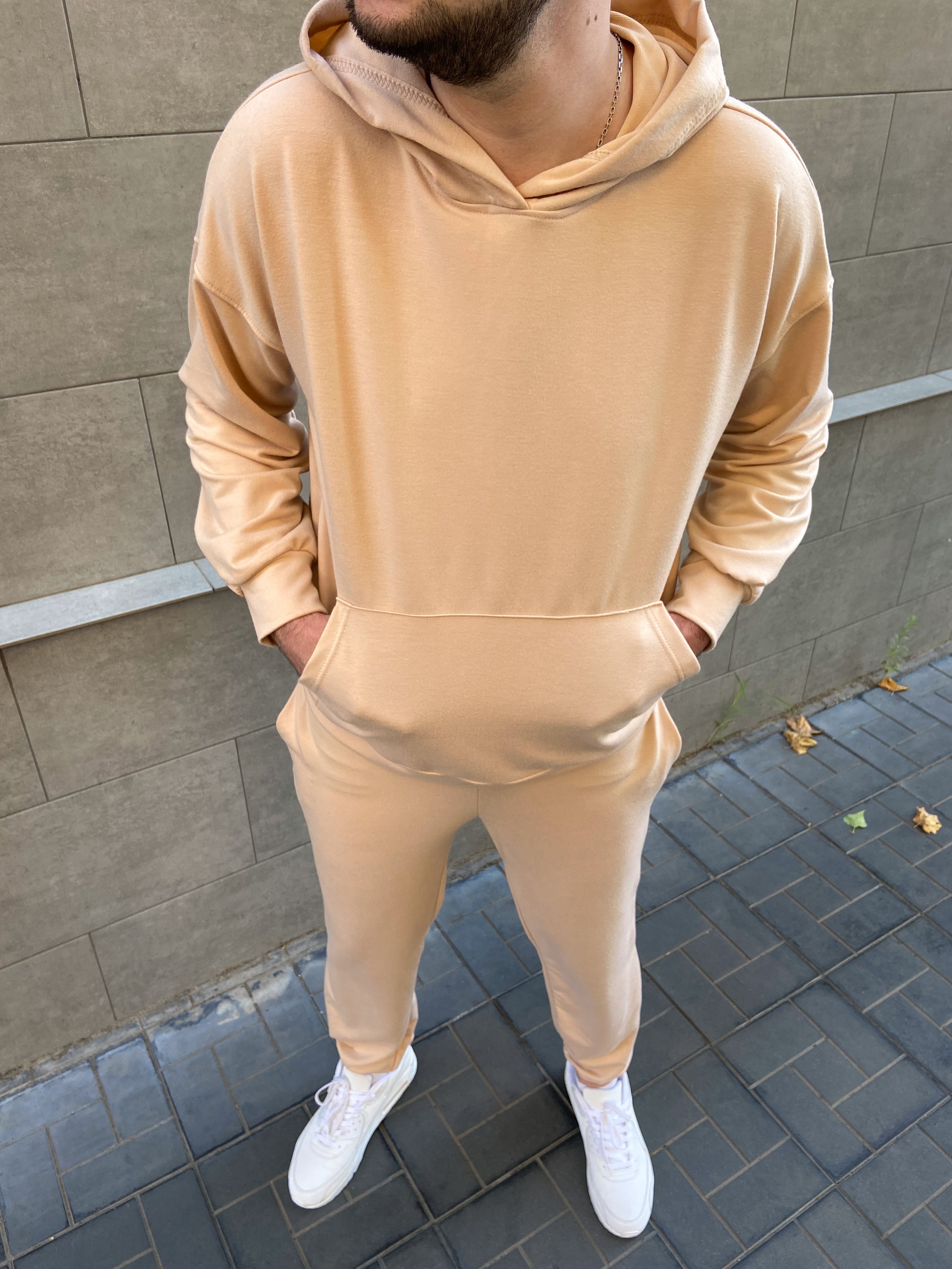Кофта "кенгурушка" со спущенным рукавом, штаны на манжетах.