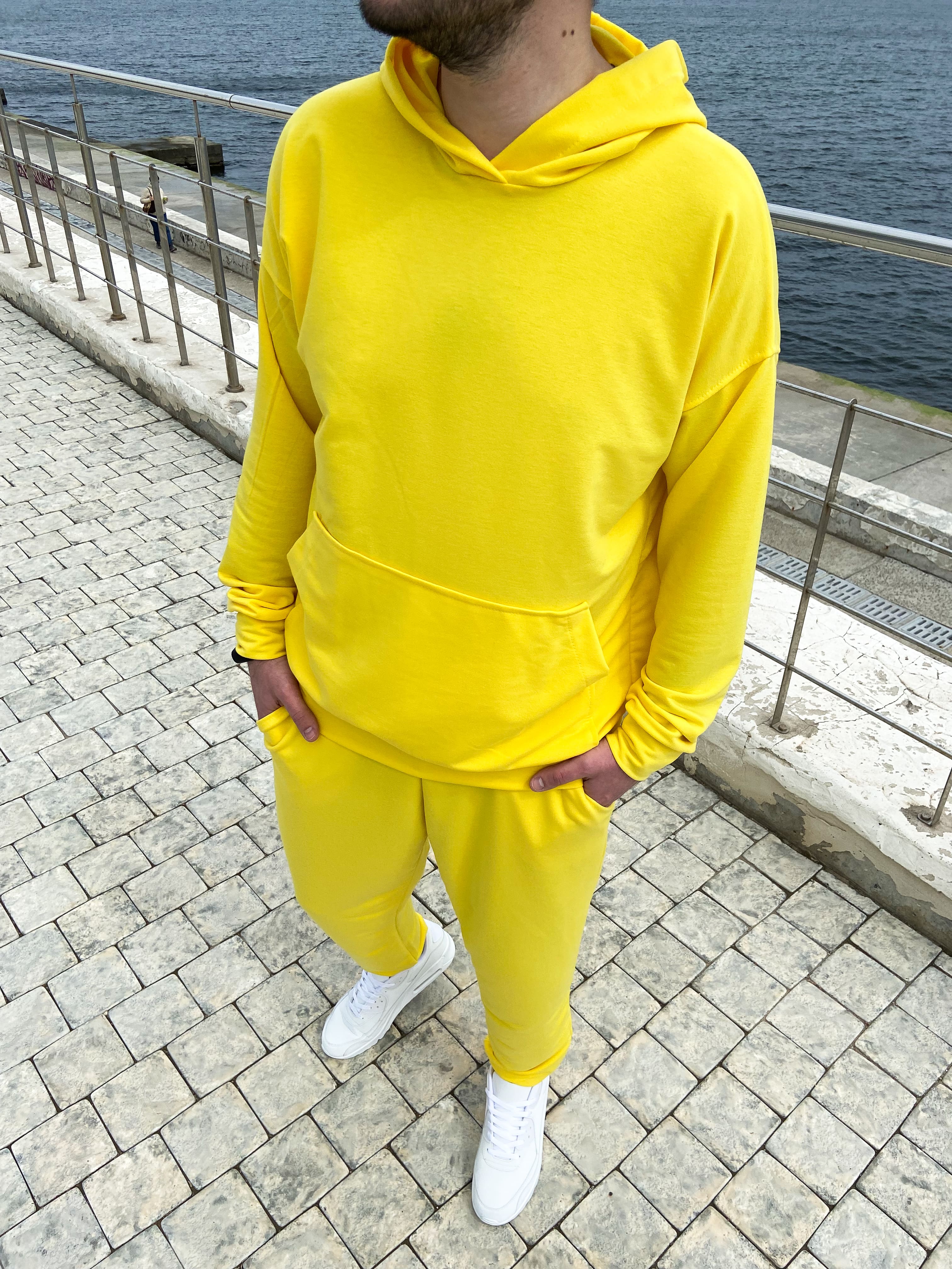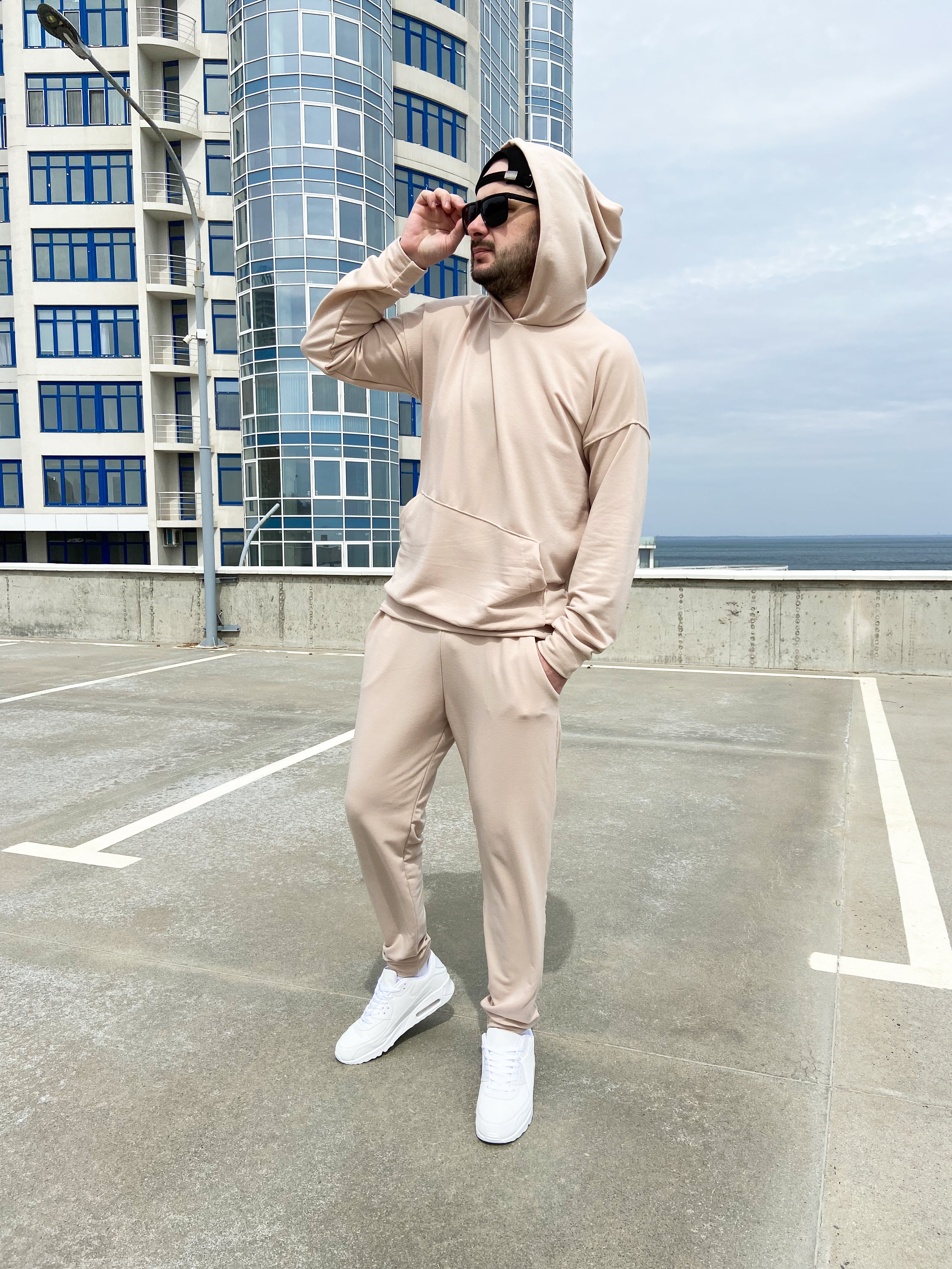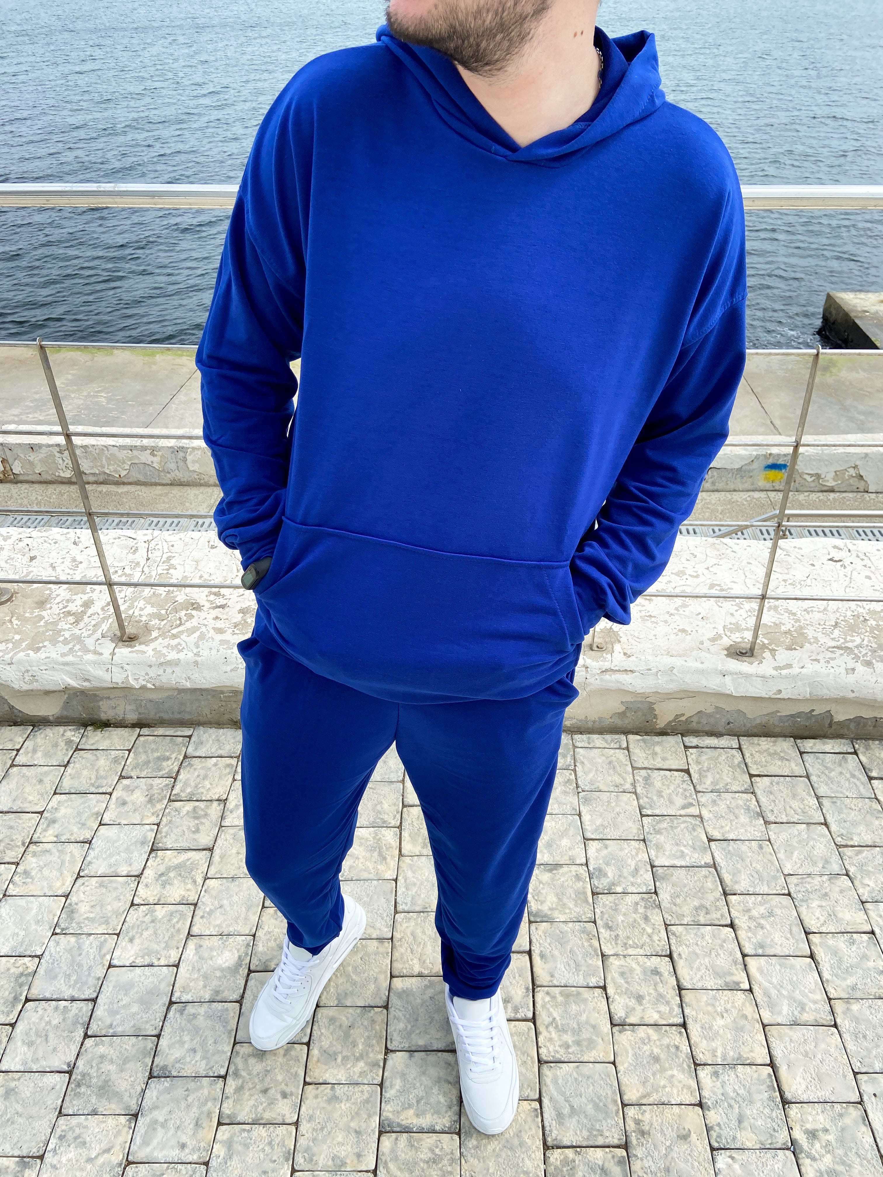 Кофта "кенгурушка" со спущенным рукавом, штаны на манжетах.