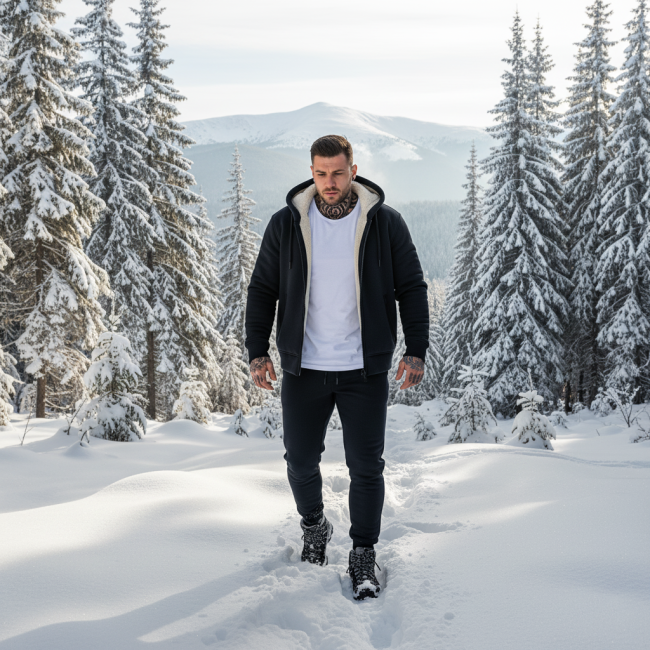 Мужской теплый костюм с мехом на кофте.