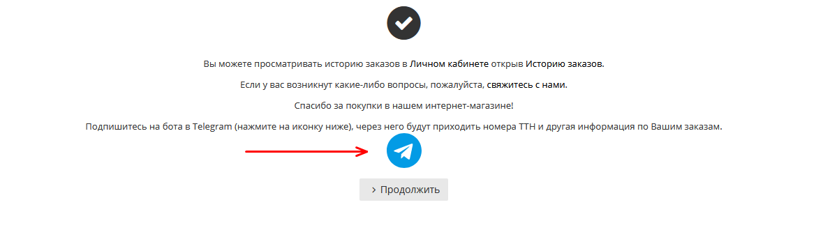 После оформления заказа, на странице с сообщением об успешном оформлении заказа нажмите на иконку "Telegram" (отмечено красной стрелкой на скриншоте ниже) , Вы перейдете в телеграм-бота, далее нажмите "Старт", Все - Вы подписаны на рассылку ТТН и статусов Ваших заказов через бота.