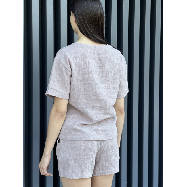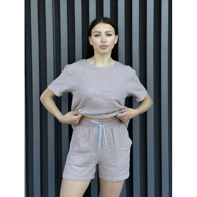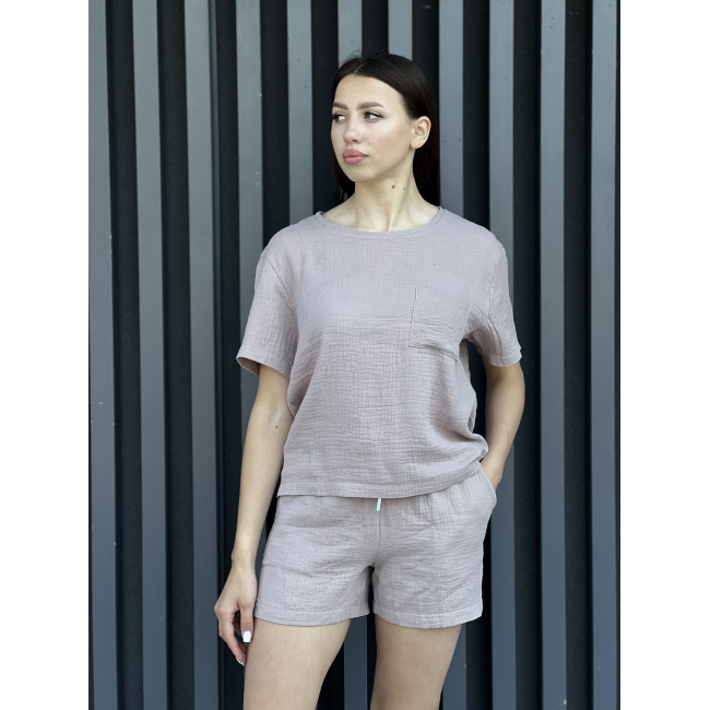 Характеристики Жіночий літній костюм з мусліну футболка з кишенею мокко